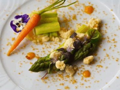 Le chef Jérôme ANTENAT, du restaurant Le58 à Thann revisite les asperges d’Alsace avec un équilibre parfait entre douceur exotique et touche piquante.