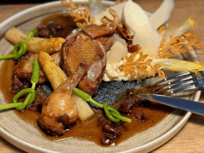 Brioche perdue, Cru cuit d’Asperges blanches d’Alsace, jambon cru fumé Fôret Noire
