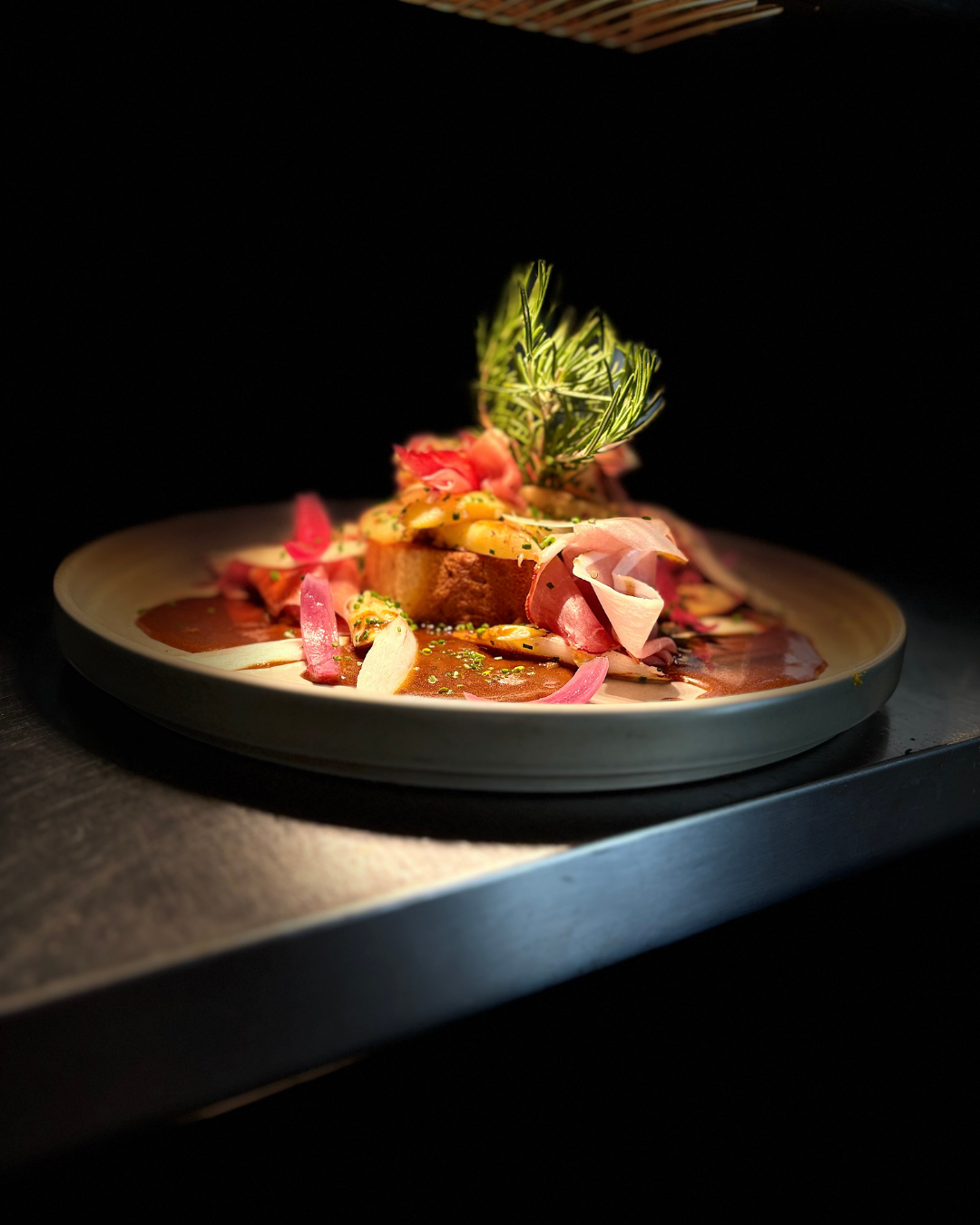 Brioche perdue, Cru cuit d’Asperges blanches d’Alsace, jambon cru fumé Fôret Noire