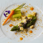 Consommé d’asperges, truite fumée et petits pois, à la coriandre fraîche