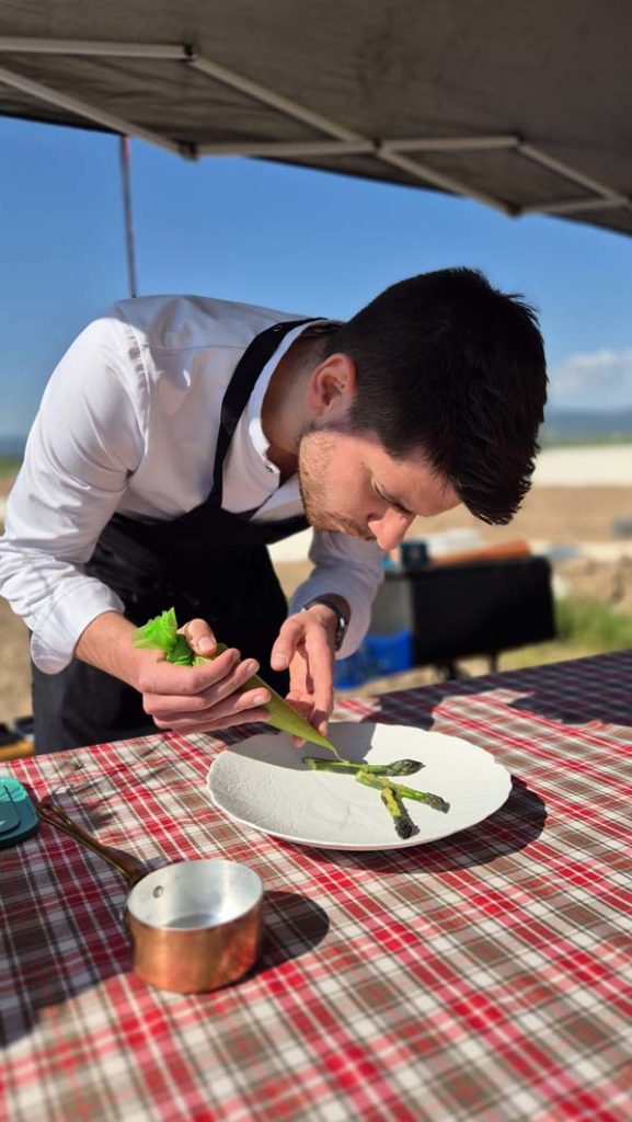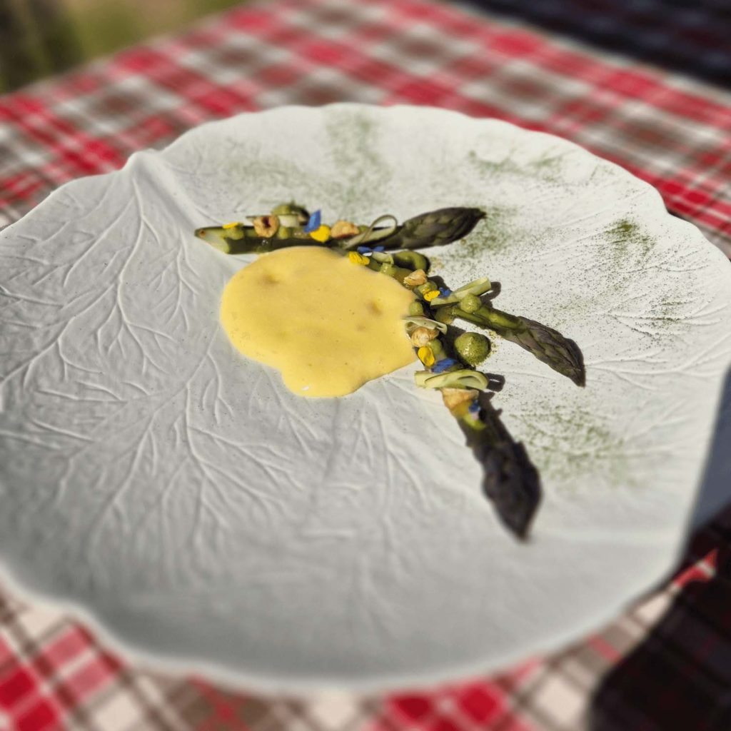 Asperges vertes et violettes en composition, espuma d’asperges blanches pour Bernard Leray, La Nouvelle Auberge à Wihr-au-Val.