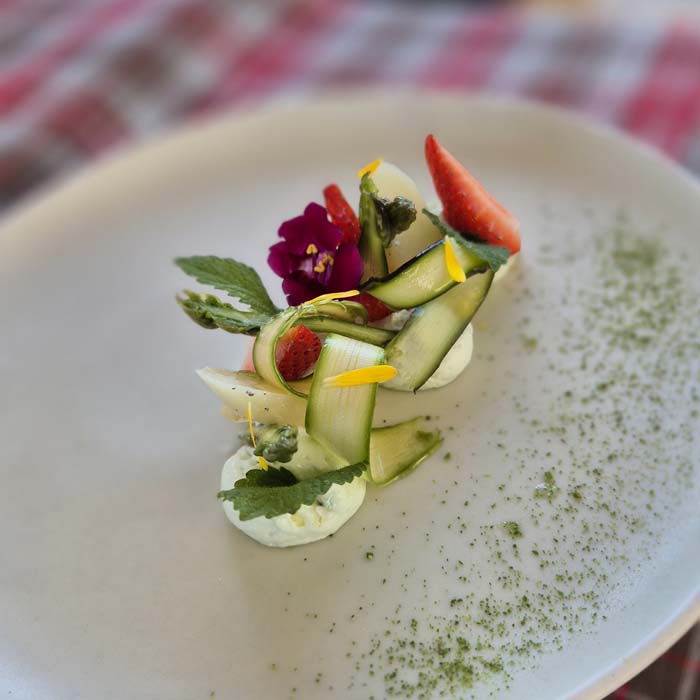 Crémeux de maïs confit au lait vanillé et fraise, copeaux d’asperges vertes pour Eric Girardin, La Maison des Têtes à Colmar.