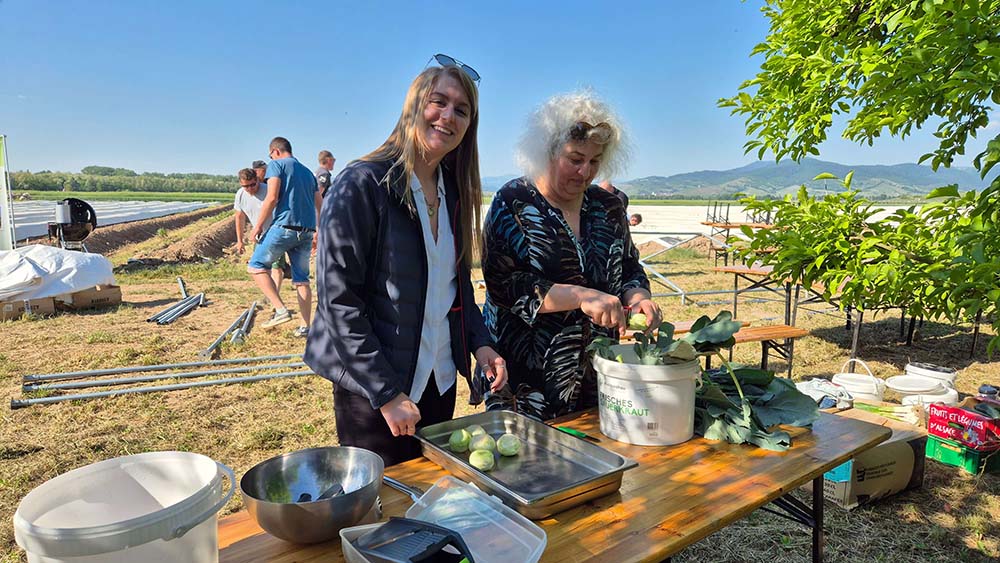 La mise en scène en plein champ, cuisine de campagne, espace ouvert et zone d’exposition, tout le monde met la main à la pâte.